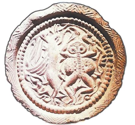 陜西淳化縣博物館收藏著一枚蟾蜍玉兔紋瓦當(dāng)。這枚蟾蜍玉兔紋瓦當(dāng)是國(guó)家一級(jí)文物,出土于咸陽市淳化縣西漢甘泉宮遺址。瓦當(dāng)面分上、下兩部分,上半部浮雕的是一只疾奔的小兔,兩前足躍起,雙耳后豎,尾巴上翹;下半部是一只起跳的蟾蜍,圓目突起,大腹鼓圓,舌長(zhǎng)伸。瓦當(dāng)造型生動(dòng)傳神,極富生活情趣。在我國(guó)古代神話傳說中,蟾蜍、玉兔是月宮里的動(dòng)物,這個(gè)構(gòu)圖無疑是取自嫦娥奔月的神話故事。