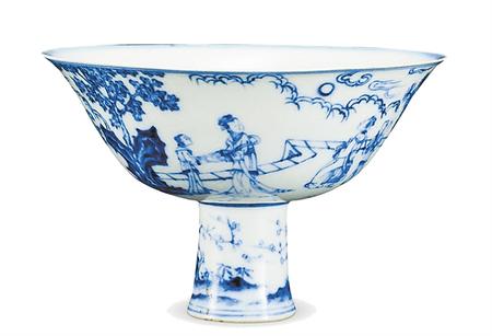 我國(guó)自古就有賞月祭月的習(xí)俗,這一習(xí)俗在文物里也有體現(xiàn),湖北省博物館收藏了一件青花瑤臺(tái)賞月圖瓷鍾。瓷鍾通高10.1厘米,口徑15.5厘米,足高4.6厘米,足徑4.2厘米,屬官窯出品,白胎,胎質(zhì)細(xì)膩,器壁光亮胎薄,叩之其聲如磬。瓷鍾上繪有“瑤臺(tái)賞月圖”,三組人物故事現(xiàn)于瓷鍾外壁:第一組有一老婦人側(cè)身坐在石墩上,身后站一侍女,雙手持扇,老婦對(duì)面站一年輕女子,其右側(cè)立一童子。第二組和第三組各有一青年女子和丫環(huán),畫面還有遠(yuǎn)山、祥云和花草。“瑤臺(tái)賞月圖”紋飾在瓷器界又被稱為“人物紋”,較為罕見,圖中人物共賞天上一輪圓月,與宋人所繪《瑤臺(tái)步月圖》一脈相承,意境優(yōu)美,風(fēng)格清新動(dòng)人。