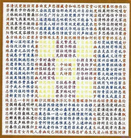 蘇蕙《璇璣圖》不僅是一束厚重的文學奇葩,也是一幅充滿創(chuàng)意的藝術巨制。她將詩歌的載體從傳統(tǒng)簡帛紙張轉換成為錦。錦是有彩色花紋的高級絲織品。以錦為書寫材料制作《璇璣圖》,除詩歌本身的創(chuàng)作外,首先需要染絲紡織。錦織好后,又要對《璇璣圖》謀篇布局,劃區(qū)設色,書詩于錦,然后一針一針地將它繡出來,變?yōu)榛匚腻\字。那每一道工序,要求都極精細,不得有半點疏忽,不然就會留下污點和遺憾。蘇蕙集眾藝于一身,完美地將其制作出來,體現了她的綜合藝術才能。取名“璇璣(泛指北斗)圖”,寓意它像北斗,可以旋轉地讀。它是在華美的錦上,又以五彩繽紛的絲線繡上《璇璣圖》,不僅顏色更加艷麗,而且那841個金玉珠璣般文字,展現的令人眼花繚亂的詩歌園地,更是前不見古人,后不見來者,比錦繡的光彩更加耀眼奪目。