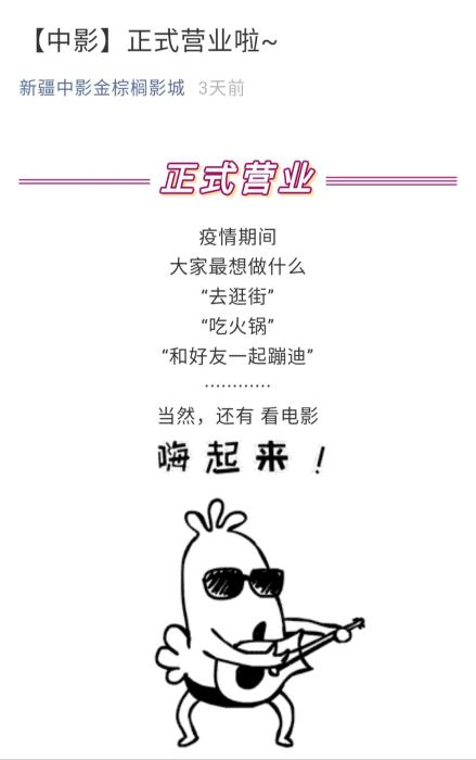 微信公眾號(hào)截圖 新疆中影金棕櫚影城近日開(kāi)始營(yíng)業(yè)