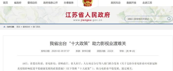 2月19日,江蘇省八部門(mén)聯(lián)合發(fā)布《關(guān)于支持全省電影業(yè)應(yīng)對(duì)新冠肺炎疫情影響促進(jìn)平穩(wěn)健康發(fā)展的政策措施》,即“影十條”,從落實(shí)稅收優(yōu)惠政策、加強(qiáng)財(cái)政支持力度、加大信貸投放、減免房租等十方面幫助電影業(yè)。
