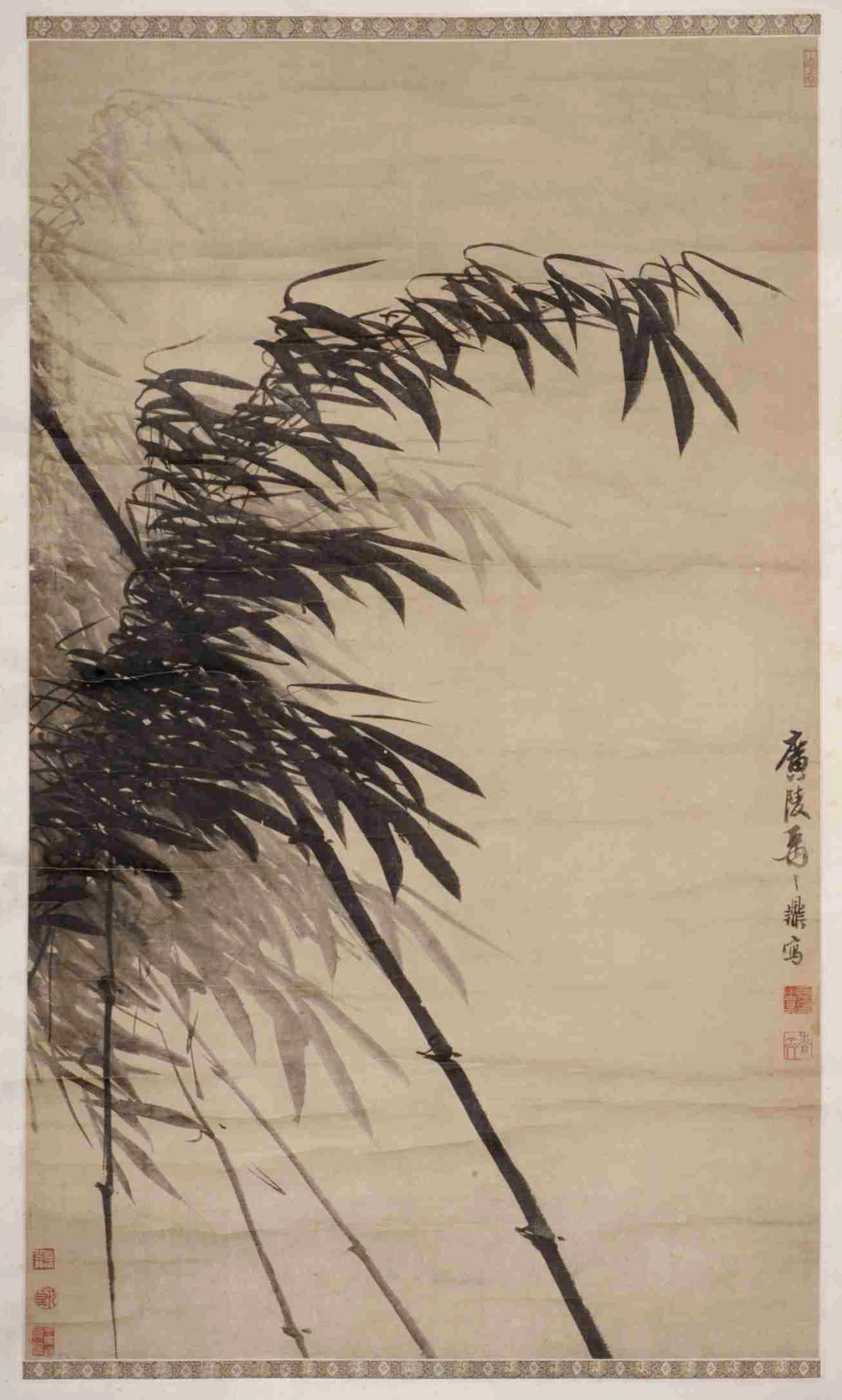 甘肅省博物館現(xiàn)藏有禹之鼎墨竹圖軸一幅,繪者運用筆墨技法,通過墨色的濃淡變化和線條的疏密組合,生動描繪出疾風吹拂而竹子迎風挺立、不甘折腰,展現(xiàn)出竹子的剛正堅直、挺拔不屈生命力與韻味,圖軸右側(cè)題款“廣陵禹之鼎寫”。