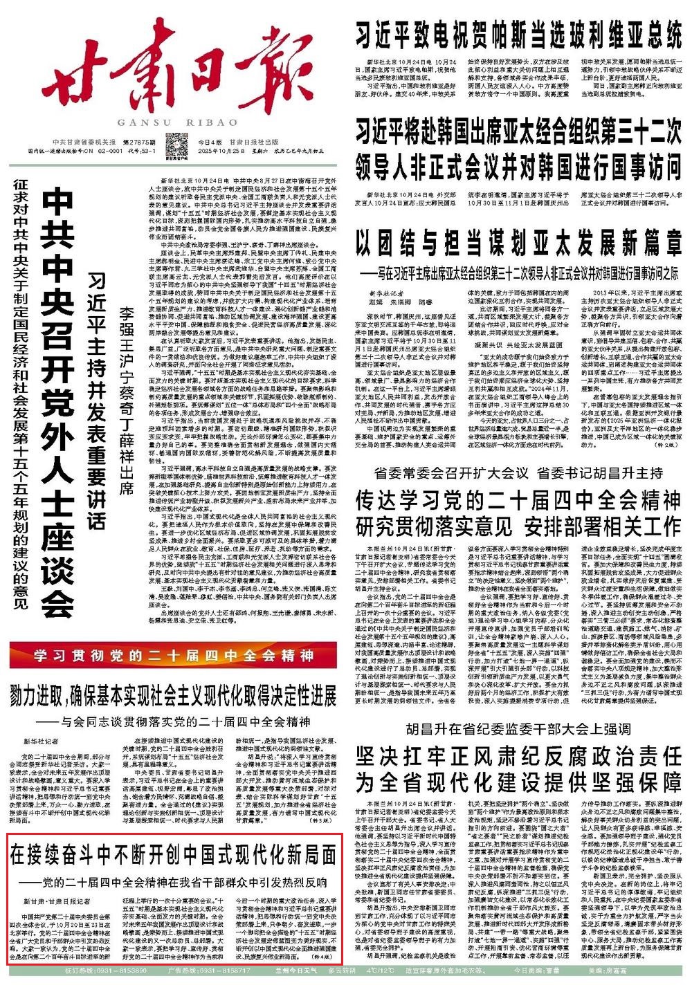 中國共產(chǎn)黨第二十屆中央委員會第四次全體會議,于10月20日至23日在北京舉行。黨的二十屆四中全會精神在全省廣大黨員和干部群眾中引發(fā)熱烈反響。大家一致認(rèn)為,黨的二十屆四中全會是在向第二個百年奮斗目標(biāo)進(jìn)軍的新征程上舉行的一次十分重要的會議。“十五五”時期是基本實(shí)現(xiàn)社會主義現(xiàn)代化夯實(shí)基礎(chǔ)、全面發(fā)力的關(guān)鍵時期。全會對未來五年我國發(fā)展作出頂層設(shè)計和戰(zhàn)略擘畫,是乘勢而上、接續(xù)推進(jìn)中國式現(xiàn)代化建設(shè)的又一次總動員、總部署。大家一致表示,要把學(xué)習(xí)好、宣傳好、貫徹好黨的二十屆四中全會精神作為當(dāng)前和今后一個時期的重大政治任務(wù),深入學(xué)習(xí)貫徹全會精神和習(xí)近平總書記重要講話精神,把思想和行動統(tǒng)一到黨中央決策部署上來,只爭朝夕、奮發(fā)進(jìn)取,一步一個腳印把全會描繪的“十五五”時期經(jīng)濟(jì)社會發(fā)展宏偉藍(lán)圖變?yōu)槊篮矛F(xiàn)實(shí),不斷開創(chuàng)以中國式現(xiàn)代化全面推進(jìn)強(qiáng)國建設(shè)、民族復(fù)興偉業(yè)新局面。