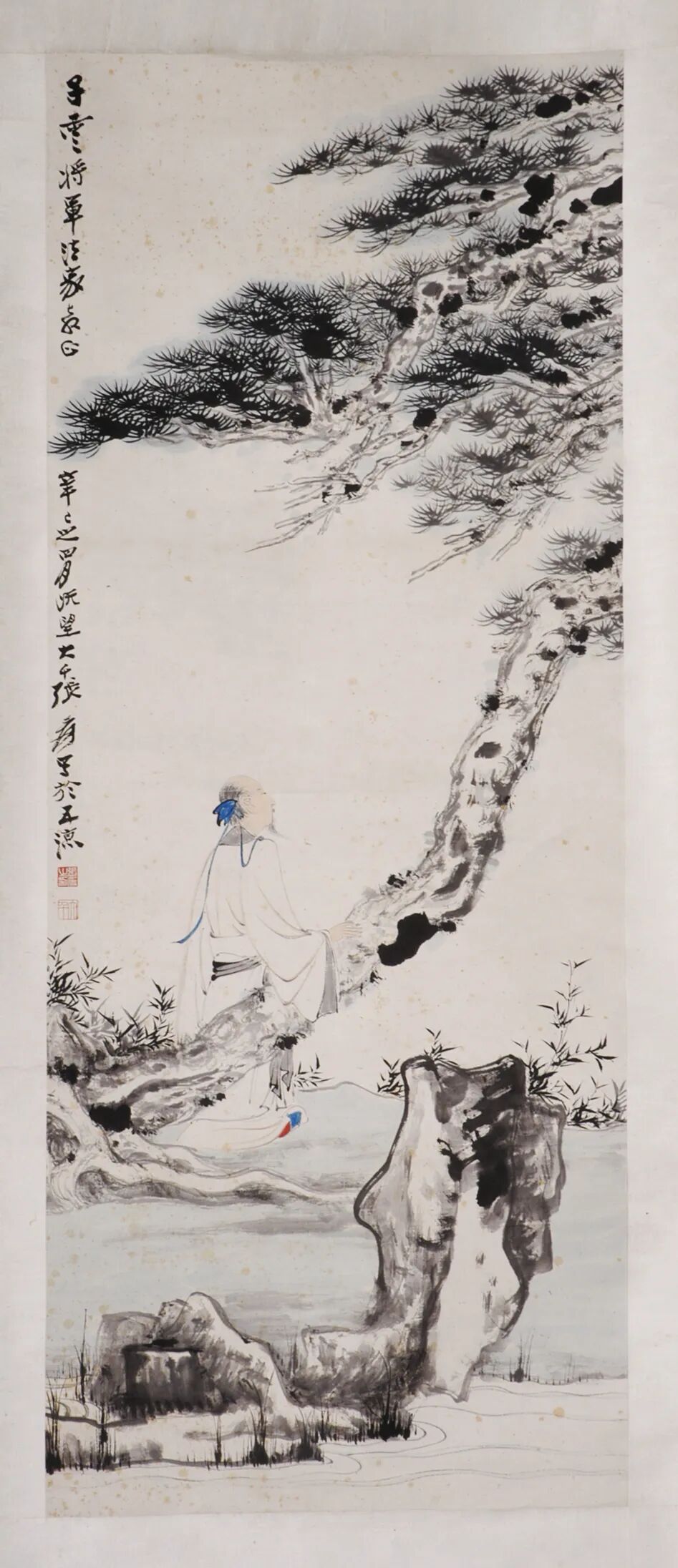 這幅作品在構圖、筆墨、設色等方面都展現(xiàn)了極高造詣。畫面采用經(jīng)典的“S”形構圖,古松自左下方向右上方蜿蜒伸展,形成強烈的動勢與韻律感。松樹以“釘頭鼠尾”描法勾勒,筆觸蘊含書法韻律:起筆如楷書之頓挫,行筆如草書之流暢,收筆若隸書之含蓄。這種源自陳洪綬而自出新意的筆法,既表現(xiàn)松樹的蒼勁質感,又暗合中國書法力透紙背的審美要求。設色上通過淡墨層層渲染,營造“素以為絢”的審美境界。畫面以水墨為主調,僅在高士衣襟處施以淡赭石,松針間點綴少許石綠。這種惜色如金的處理方式,既保持文人畫“淡而不厭”的審美特質,又通過微妙色彩對比增強藝術感染力。