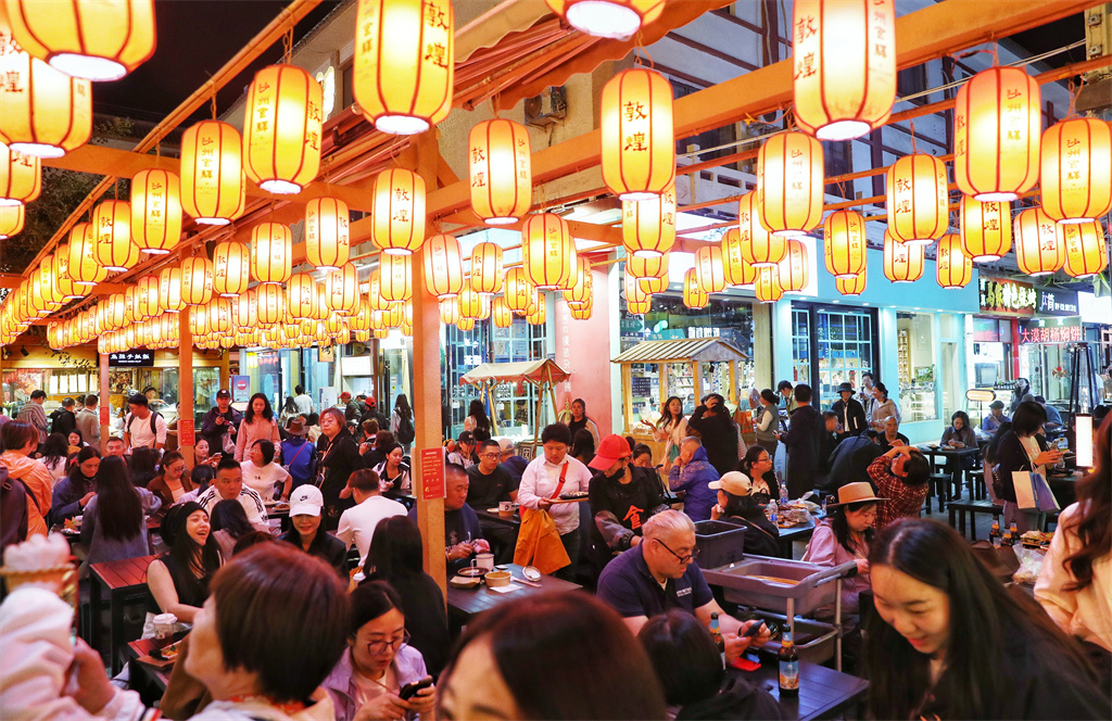 夜幕下的夜市主街區(qū),漢唐風(fēng)格的飛檐斗拱在燈光中錯(cuò)落延伸,3000余盞仿古絲綢燈籠如星河垂落,與北斗七星造型的景觀燈帶遙相呼應(yīng)。改造后的攤位統(tǒng)一采用原木色雕花圍擋,身著胡服漢裝的攤主們穿梭其間,吆喝聲與烤架升騰的煙火氣交織,恰似《敦煌廿詠》中“萬(wàn)商爭(zhēng)利處,燈影伴駝鈴”的盛景復(fù)現(xiàn)。新設(shè)的“絲路長(zhǎng)桌宴”區(qū)域,更將西域風(fēng)味與中原美食融合,令游客體驗(yàn)“一席嘗遍敦煌味”的舌尖之旅?! ?/p>