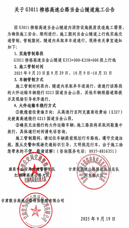 中國(guó)甘肅網(wǎng)9月22日訊(西北角·中國(guó)甘肅網(wǎng)記者 宋芳科)記者從敦當(dāng)高速公路項(xiàng)目部門獲悉,因G3011柳格高速當(dāng)金山隧道內(nèi)消防設(shè)施提質(zhì)改造施工需要,為確保施工安全、順利進(jìn)行,2025年9月23日至9月29日,10月9日至10月31日,兩個(gè)時(shí)間段,G3011柳格高速當(dāng)金山隧道K353+000-K358+000段上行線將實(shí)施管制。國(guó)慶期間停止施工,保障通行。