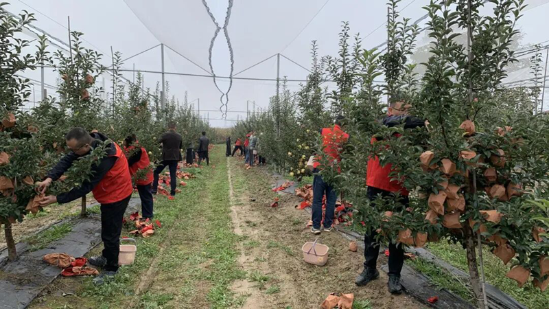 在果農(nóng)岳世德家的果園里,平日里伏案工作的干部職工們,此刻化身“采摘工”,忙碌的身影在果樹間穿梭,鮮艷的紅馬甲與紅蘋果互相映襯。