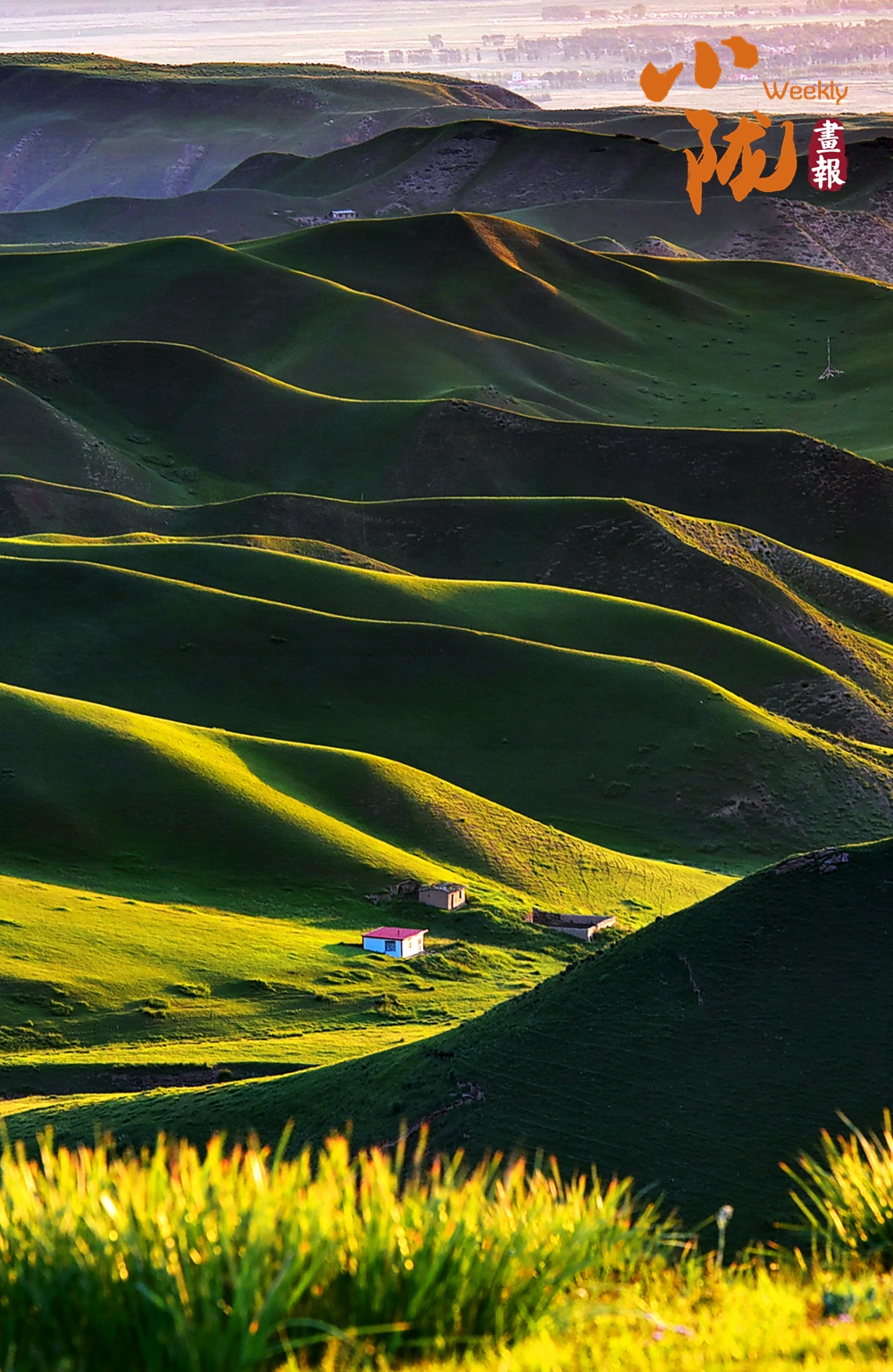連綿起伏的草原,層次分明,形成了一道道綠色的波浪,像是大地隆起的脊梁,高聳入云,屹立在天地之間,展現(xiàn)出壯美的畫卷。
