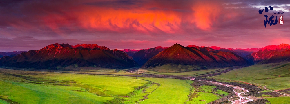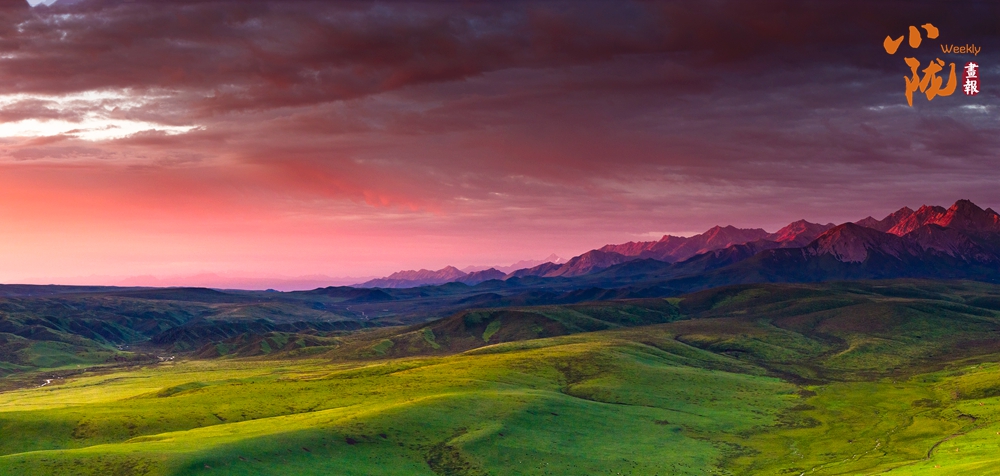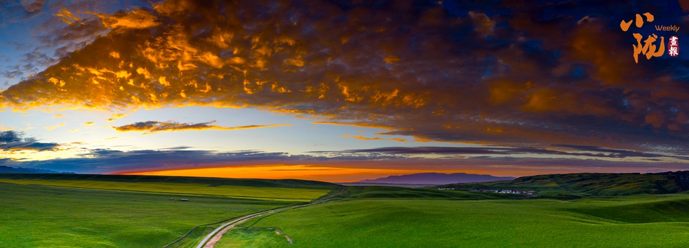 夕陽西下的時候,晚霞將西邊的天空映得通紅,云朵如火焰般燃燒。而此時,五彩的山巒與綠色的草原相互映襯,形成鮮明對比,十分壯觀和漂亮。