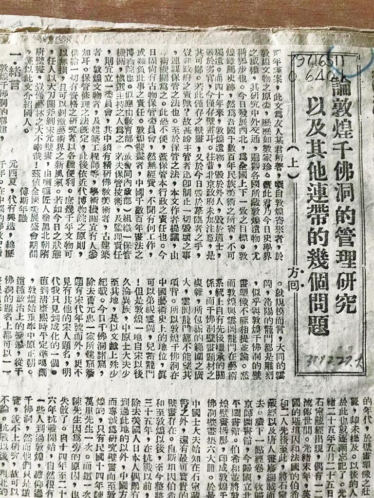 向達(dá)先生曾先后兩次考察敦煌,第一次是在1942年4月,中央研究院組織西北史地考察團(tuán),其中的歷史考古組由中央研究院歷史語言研究所、中央博物院與北京大學(xué)聯(lián)合組成,向達(dá)代表北大并擔(dān)任歷史考古組主任。在這次考察中,他在給友人、南京博物院院長(zhǎng)曾昭燏的信件中講述了他第一次看到敦煌莫高窟時(shí)的激動(dòng)心情,同時(shí)對(duì)于莫高窟受到自然和人為的毀壞而感到痛心。他用三天的時(shí)間寫成了一萬多字、此后對(duì)敦煌學(xué)有重大影響的《論敦煌千佛洞的管理研究以及其他連帶的幾個(gè)問題》,署名“方回”寄給了傅斯年,后經(jīng)傅斯年推薦,在重慶的《大公報(bào)》連載發(fā)表,文中提出將千佛洞收歸國(guó)有,由學(xué)術(shù)機(jī)構(gòu)進(jìn)行管理,開展研究工作等建議。此文發(fā)表,一石激起千層浪,直接推動(dòng)國(guó)立敦煌藝術(shù)研究所于1944年成立。研究所成立后,常書鴻任所長(zhǎng)。這也開啟了“敦煌學(xué)”長(zhǎng)流不息的淵源。樊錦詩后來也撰文稱:“他(向達(dá))文章中提出的關(guān)于保護(hù)和管理的具體建議,被后來成立的敦煌藝術(shù)研究所采納,成為敦煌石窟保護(hù)和管理的參照。向達(dá)提出的‘不可輕易剝離壁畫’的主張,也是敦煌研究院幾十年來在壁畫保護(hù)和管理中一直恪守的紀(jì)律和原則。”