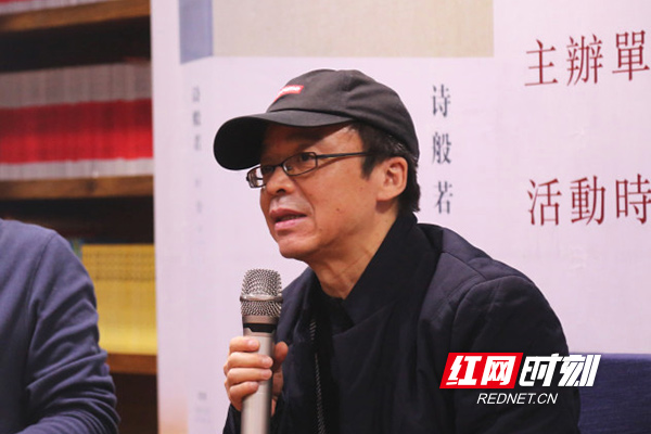 “葉舟是在西北行走的邊疆詩(shī)人,頭頂著一片沙漠。”王躍文為現(xiàn)場(chǎng)觀眾解開(kāi)了葉舟的“帽子之謎”,也不經(jīng)意揭開(kāi)了一段塵封的“事故”——葉舟曾在西北出過(guò)車(chē)禍,頭皮里還留著沙子。王躍文說(shuō),王絲綢之路曾經(jīng)遍地佛國(guó),“佛性”,正是《詩(shī)般若》的創(chuàng)作母體,“見(jiàn)山是佛,見(jiàn)水是佛,見(jiàn)胡楊林也是佛,見(jiàn)敦煌壁畫(huà)上的馬也是佛。”