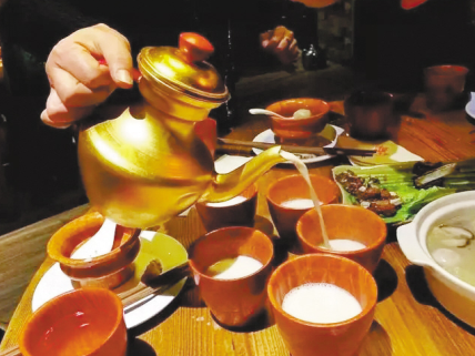 喝酥油茶所用的茶具也非常講究,所用的壺大多為金屬制品,比如銀壺、銅壺、鋁壺、瓷鐵彩花壺等,壺嘴、壺把造型別致,壺的頸腹部大多繪有彩色民族圖案;所使用的茶碗則大多為木制或是陶瓷制品,上面有銀或是銅鑲嵌。