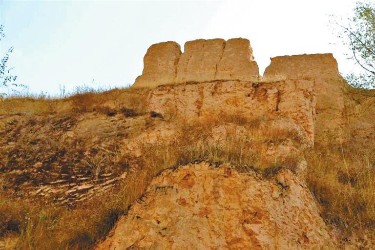 在威戎鎮(zhèn)見(jiàn)到的第一處遺存,是位于威戎鎮(zhèn)廣場(chǎng)后的一處臺(tái)地。這一處遺存,是一段殘破的老城墻,以及一座形似堡樓的殘?jiān)?。站在臺(tái)地之下,仰望斷墻,人工修筑的痕跡十分明顯,層層黃土夯筑,因?yàn)閺U棄殘破而長(zhǎng)滿(mǎn)了荒草。走近堡樓,可以看見(jiàn)當(dāng)時(shí)修筑時(shí)搭建木椽的孔洞,還有很多手掌大小的圓形石塊。