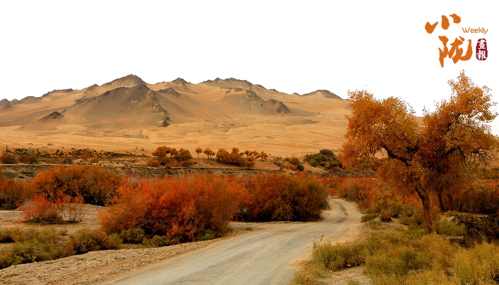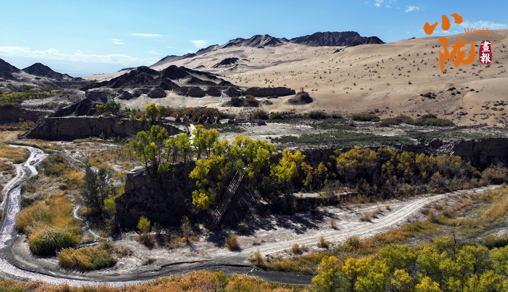 這里山勢奇特,因溝深線長,猶如峽谷,溝邊自生許多胡楊,被稱為“胡楊峽”。你看,溝邊沙山林立,千年胡楊挺拔,溝內溪水清澈纏綿,天然的紅柳、蘆葦、梭梭、沙棗樹等植被錯落有致,共同繪就了一幅秋日畫卷。