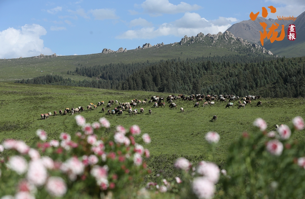 在起伏的丘陵間,廣袤的草原宛如少女柔美的曲線(xiàn),美得簡(jiǎn)直超出想象,綠草茵茵、繁花似錦,微風(fēng)吹過(guò),濃郁的花香撲鼻而來(lái)。那連綿的群山、蜿蜒的河流,交織成網(wǎng),將這片土地滋潤(rùn)成生命的綠洲。