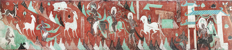 這幅壁畫在藝術風格上獨樹一幟,深受中原繪畫形式的影響。它既摒棄了印度壁畫的環(huán)形構(gòu)圖方式,又不同于龜茲壁畫里的菱形畫面布局,而是開創(chuàng)性地采用了連環(huán)畫式的長卷式構(gòu)圖,宛如一條歷史的長河,將故事娓娓道來。