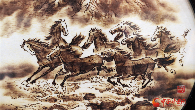 從學徒到代表性傳承人,張志光的堅守藏在日復一日的練習里。他不僅精通山丹烙畫的選材、畫面設計及裝飾工藝,更在2018年邁出創(chuàng)新步伐——將山丹馬元素融入創(chuàng)作。手持電烙鐵在木板上游走,他筆下的山丹馬或奔騰跳躍、或昂首嘶鳴,線條流暢、明暗有致,仿佛被賦予生命,盡顯西北大地的豪邁神韻。“山丹烙畫是我一生的熱愛,早成了生活里離不開的部分。”張志光的話語里,滿是對這門技藝的深情。