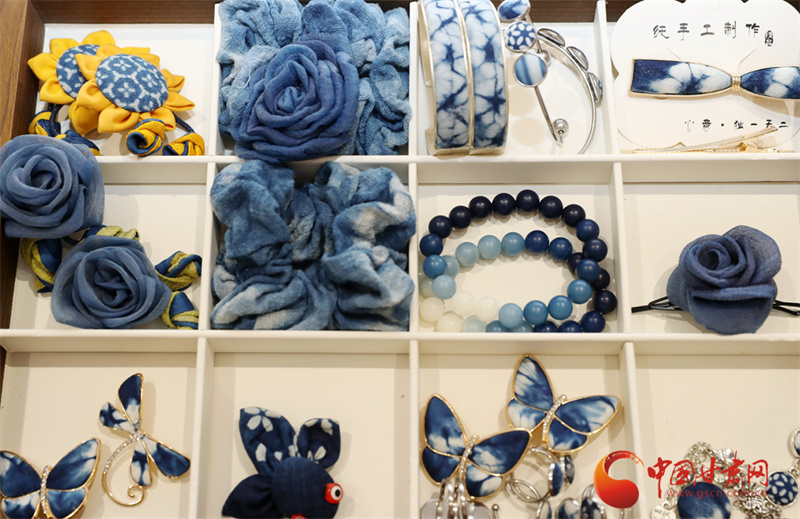 染好的布匹還要經(jīng)過(guò)脫漿、清洗、陰干,最后才是拆線、整理。當(dāng)一塊完整的藍(lán)印花布展現(xiàn)在眼前時(shí),李梅總會(huì)輕輕撫摸布料,仿佛在與草木對(duì)話。她的工作室里,掛滿(mǎn)了用藍(lán)染制成的物件:桌布上印著成片的板藍(lán)根葉,茶席邊緣綴著小巧的藍(lán)染布扣,就連她日常穿的棉麻衫,也是自己染的淡藍(lán)色。“這些布不是冰冷的商品,是帶著土地溫度的生活。”李梅說(shuō),去年她在平?jīng)龉懦情_(kāi)了一間“藍(lán)染生活館”,游客可以跟著她學(xué)種板藍(lán)根、體驗(yàn)扎染,很多人第一次發(fā)現(xiàn),原來(lái)衣服上的藍(lán)色可以來(lái)自田野,非遺技藝能如此貼近日常。