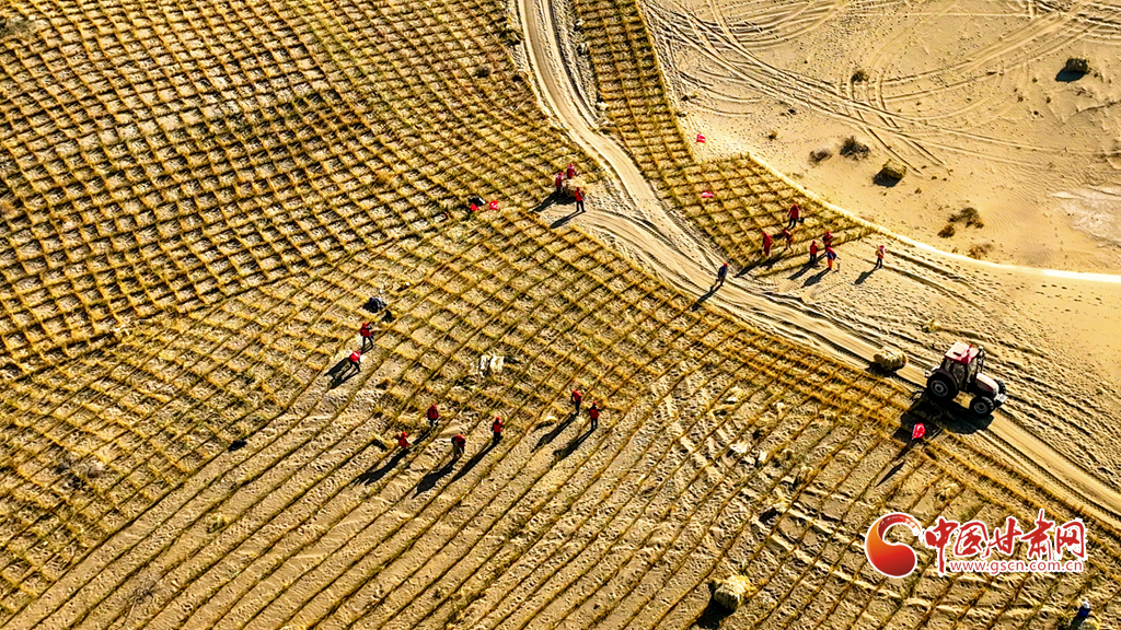 據(jù)了解,明花鄉(xiāng)地處巴丹吉林沙漠邊緣,沙化戈壁面積超過40萬畝,是國家“三北”防護(hù)林體系建設(shè)和北方防沙帶的關(guān)鍵區(qū)域。多年來,當(dāng)?shù)厝罕姵掷m(xù)開展防沙治沙,與危害生態(tài)的“黃龍”展開了一場“人進(jìn)沙退”的持久戰(zhàn)。時(shí)下,3.27萬畝“草方格沙障+高立式PE網(wǎng)沙障”沙化土地治理項(xiàng)目正緊鑼密鼓地推進(jìn)實(shí)施。