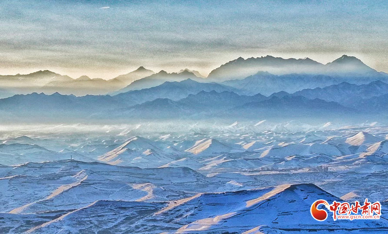 初冬時節(jié),位于張掖市民樂縣境內(nèi)的祁連山脈巍峨群鋒被一場大雪妝點的銀裝素裹,分外妖嬈,儼然一幅千里冰封萬里雪飄的北國風(fēng)光圖。